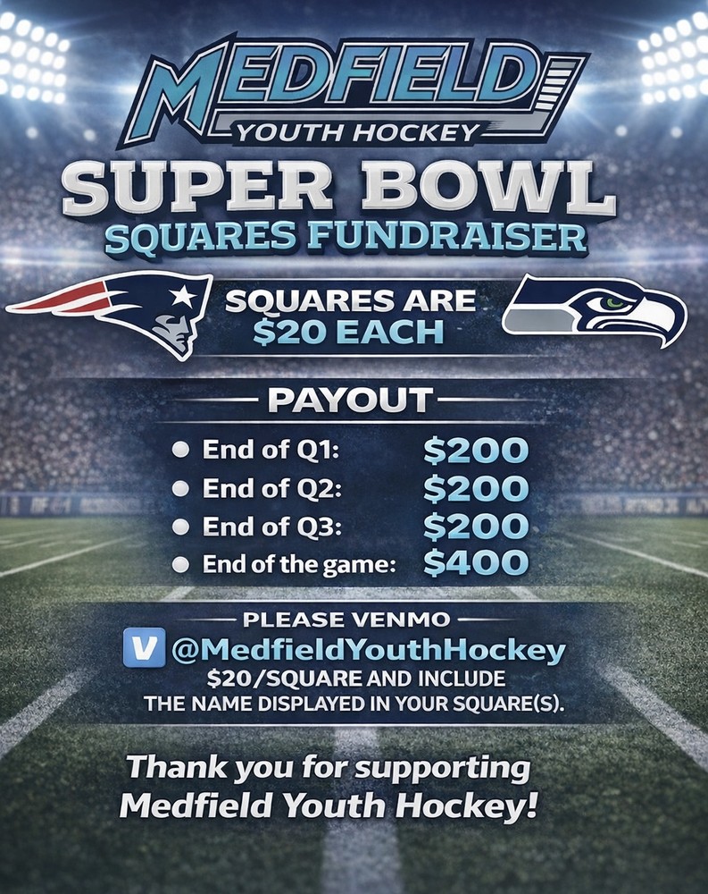 Please Venmo @MedfieldYouthHockey, $20/square and please include the name displayed in your square(s).