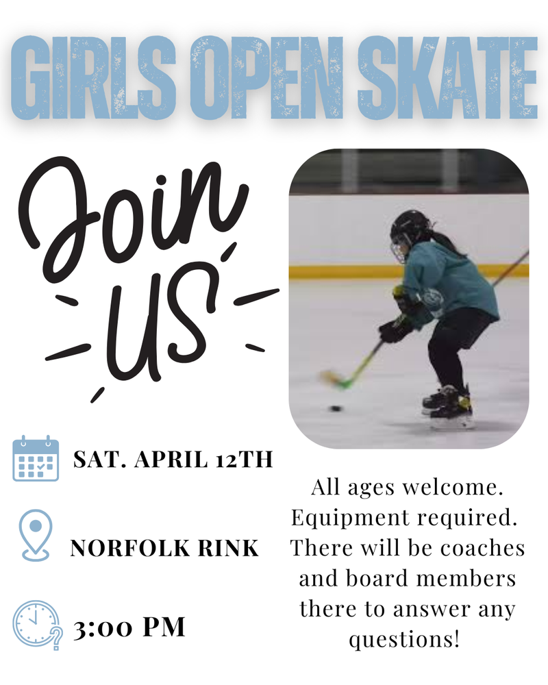 Join us for a girls only OPEN SKATE. Open to all ages. Equipment required. Saturday, April 12th at 3:00 at Norfolk Arena. We hope to see you there!